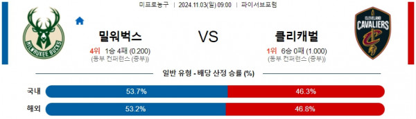 2024 11월 03일 밀워키 벅스 클리블랜드 NBA 분석