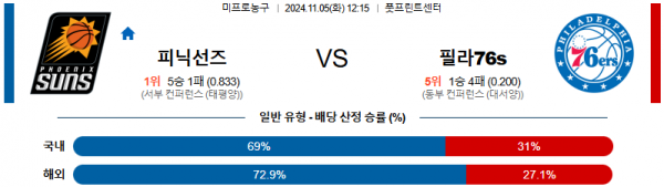2024 11월 05일 피닉스선즈 필라델피아 76s NBA 분석