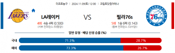 11월 9일 NBA LA레이커스 필라델피아 미국프로농구분석 스포츠분석