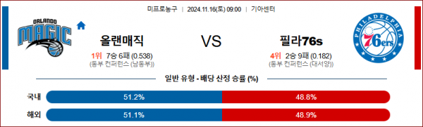 11월 16일 NBA 올랜도 필라델피아 미국프로농구분석 스포츠분석