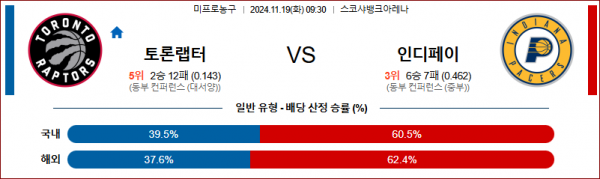 11월 19일 NBA 토론토 인디애나 미국프로농구분석 스포츠분석