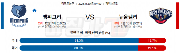 11월 30일 NBA 멤피스 뉴올리언스 미국프로농구분석 스포츠분석