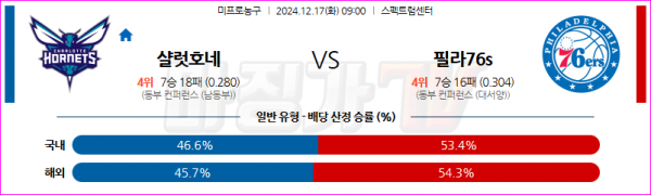 12월 17일 NBA 샬럿 호네츠 필라델피아 76ERS 미국프로농구분석 스포츠분석