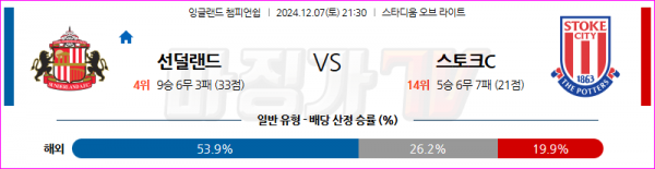 12월 7일 잉글랜드 챔피언쉽 선덜랜드 AFC 스토크 시티 해외축구분석 스포츠분석