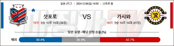 삿포로는 강등 확정 이후 유종의 미를 위해 공격적으로 나설 것이나, 단순한 전술로 가시와의 견고한 수비를 뚫기 어려울 전망이다. 반면 가시와는 속공 중심의 전략을 펼치겠지만, 공격 자원 부재로 인해 득점력이 저조하다. 무승부와 언더(2.5 기준)가 예상되는 경기다.