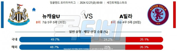 2024 12월 27일 뉴캐슬 유나이티드 아스톤 빌라 프리미어리그 분석