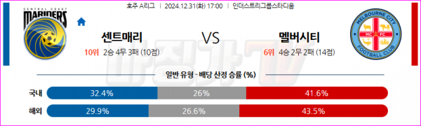 12월 31일 호주 1부 센트럴 코스트 마리너스 FC 멜버른 시티 FC 아시아축구분석 스포츠분석