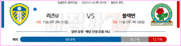 1월 2일 잉글랜드 챔피언쉽 리즈 유나이티드 FC 블랙번 로버스 해외축구분석 스포츠분석