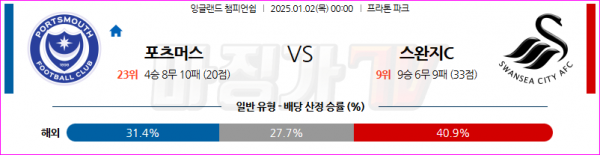 1월 2일 잉글랜드 챔피언쉽 포츠머스 FC 스완지 시티 해외축구분석 스포츠분석