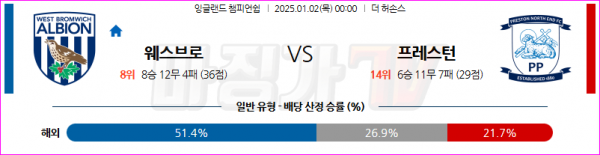 1월 2일 잉글랜드 챔피언쉽 웨스트 브로미치 앨비언 프레스턴 노스 엔드 해외축구분석 스포츠분석