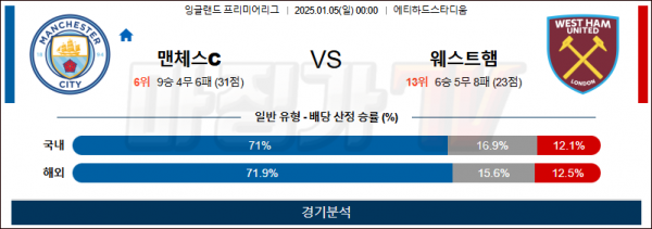1월 5일 EPL 맨체스터시티 웨스트햄 해외축구분석 스포츠분석