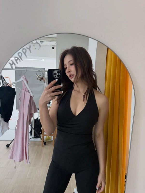 공개된 사진 속 남지현은 블랙 컬러의 슬리브리스 톱과 레깅스를 매치한 올블랙 룩으로 거울 앞에 서 있다. 깊게 파인 브이 네크라인과 자연스럽게 잡힌 허리 라인이 어우러지며 군더더기 없는 실루엣을 완성했다.