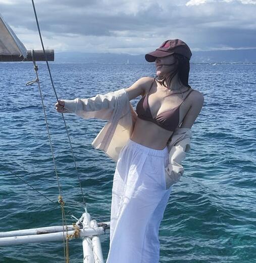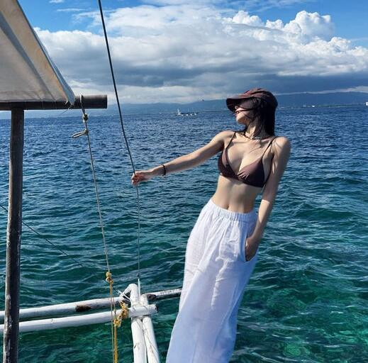 12일 이솔이는 자신의 소셜 계정에 다양한 사진을 공개했다. 구름이 가득한 푸른 하늘과 청록빛 바다 물결이 아름다운 곳을 배경으로 둔 채 이솔이는 요트 위로 보이는 곳에서 끝을 잡고 서서 포즈를 취하고 있었다.