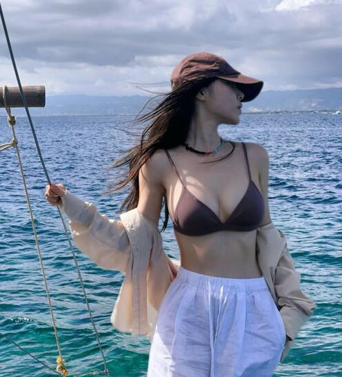 이날 이솔이는 브라운 톤 비키니로 탄탄한 복근을 자랑했다. 하의는 아마천 소재의 흰 바지를 입어 시원하면서도 노출 없는 컷을 완성했다.