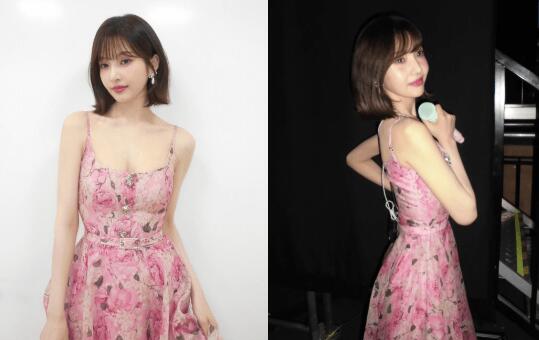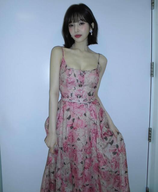 공개된 사진 속 조이는 꽃무늬 핑크 슬립 드레스를 입고 무대 뒤편에서 카메라를 향해 밝은 미소를 지었다. 잘록한 허리와 일자 쇄골, 직각 어깨라인이 한층 가녀린 실루엣을 완성했다.