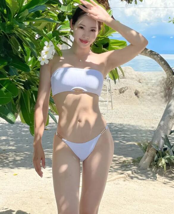 사진 속 신수지는 화이트 컬러의 심플하면서도 세련된 비키니를 입고 있다. 그녀의 완벽한 몸매와 탄력 있는 피부는 단숨에 눈길을 끌며, 건강미 넘치는 모습으로 팬들에게 큰 인상을 남겼다. 비키니 상의는 튜브톱 스타일로, 밑단의 금속 장식이 고급스러움을 더한다. 하의는 섬세한 디테일이 가미된 얇은 스트랩 디자인으로, 신수지의 매끈한 다리와 허리를 더욱 돋보이게 한다.