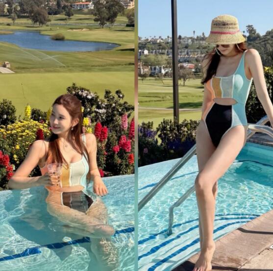 특히 골프장이 한눈에 내려다보이는 공간에서 라운딩 대신 수영을 즐기는 색다른 분위기가 눈길을 끈다. 선글라스와 모자, 자연스러운 스타일링까지 더해지며 휴양지 같은 무드를 완성했다.