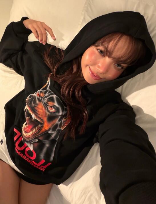 화려한 모습뿐만 아니라 일상에서의 소탈한 매력도 돋보인다. 리사는 자신의 소속사인 ‘LLOUD’ 로고가 새겨진 오버사이즈 티셔츠를 입고 포즈를 취하는 가 하면, 커다란 도베르만 그래픽이 그려진 후드 티셔츠를 입고 장난스러운 표정을 짓기도 했다.