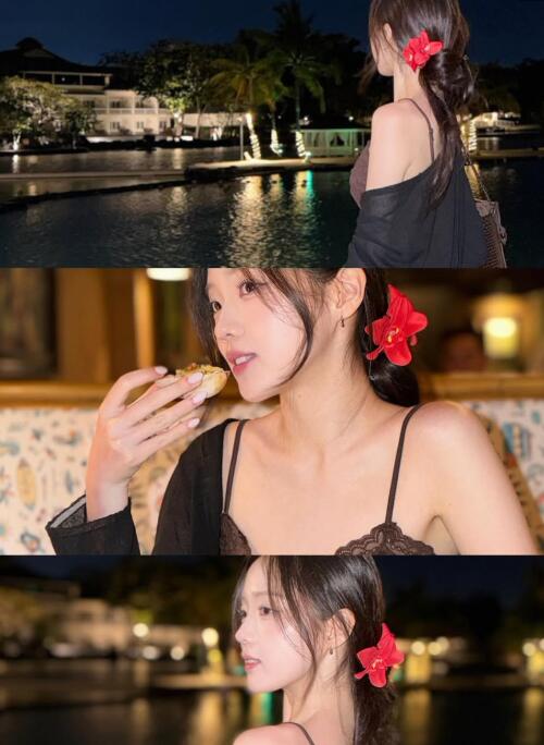 또 다른 사진에서는 거울 셀카와 함께 내추럴한 분위기의 휴양지 패션을 선보였다. 군더더기 없는 라인과 자연스러운 포즈가 어우러지며 마치 화보 같은 분위기를 완성했다. 이어진 야경 사진에서는 머리에 꽃을 꽂은 채 우아한 옆모습을 드러내며 색다른 매력을 더했다.