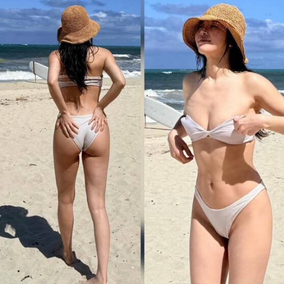 뒤태가 담긴 컷에서는 힙라인과 다리 길이가 강조되며 이러한 착시가 더욱 극대화됐다. 단순한 비키니 노출을 넘어 ‘비율 반전’ 장면으로 이어진 셈이다.