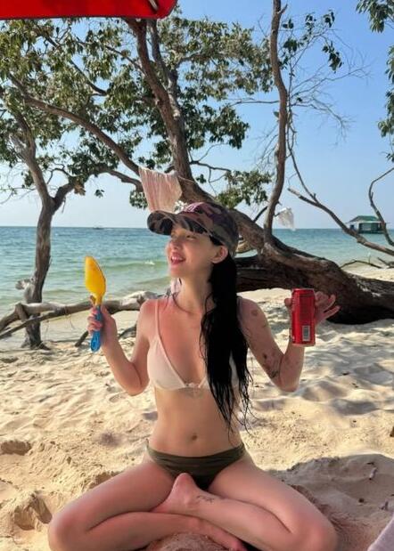 공개된 사진에는 해변에서 휴가를 즐기고 있는 지민의 모습이 담겨 있었다. 지민은 카키색과 흰색을 매치한 비키니를 입고 나무 위에 오르면서 장난기 넘치는 모습을 보여줬다. 긴생머리 스타일에 모자를 더해 센스 있는 비키니 패션을 완성했다.