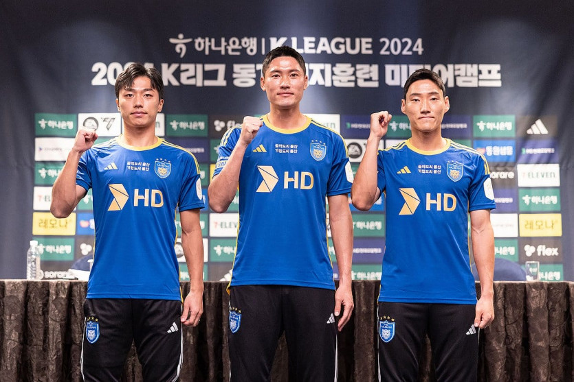 프로축구 K리그1 울산 HD(옛 울산 현대)에 새로 합류한 고승범(왼쪽부터), 황석호, 심상민이 7일 울산시 동구 호텔현대 바이 라한 울산에서 열린 2024 K리그 동계 전지훈련 미디어캠프 기자회견에서 포즈를 취하고 있다. [한국프로축구연맹 제공. 재판매 및 DB 금지]