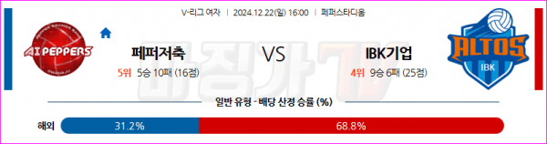 12월 22일 V-리그 여자부 페퍼저축은행 IBK 기업은행 국내배구분석 스포츠분석